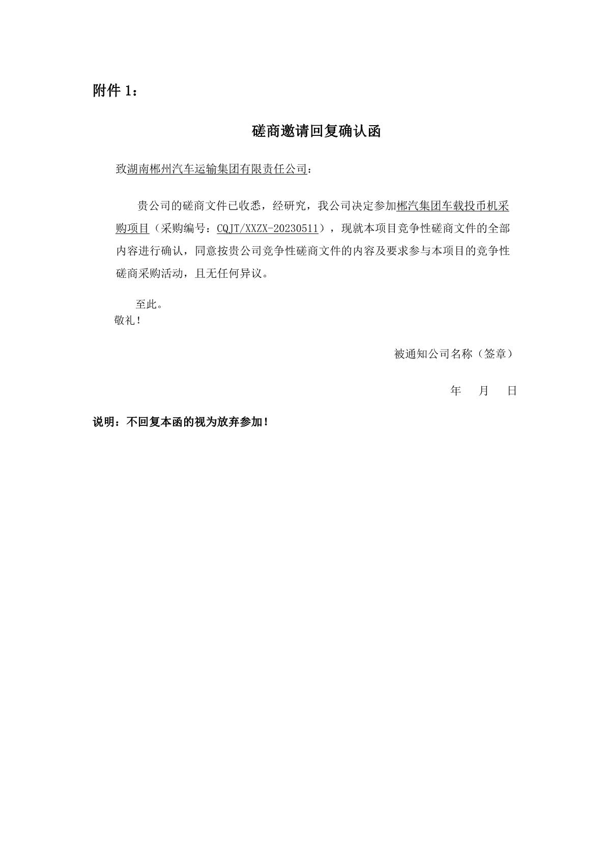 你單位收到磋商文件后,請(qǐng)于2023年5月26日17時(shí)前來(lái)函確認(rèn)是否參加競(jìng)爭(zhēng)性磋商采購(gòu)活動(dòng)。若未收到你方書(shū)面確認(rèn),將視為你方已放棄參加本項(xiàng)目競(jìng)爭(zhēng)性蹉商采購(gòu)活動(dòng)(格式見(jiàn)附件1)。